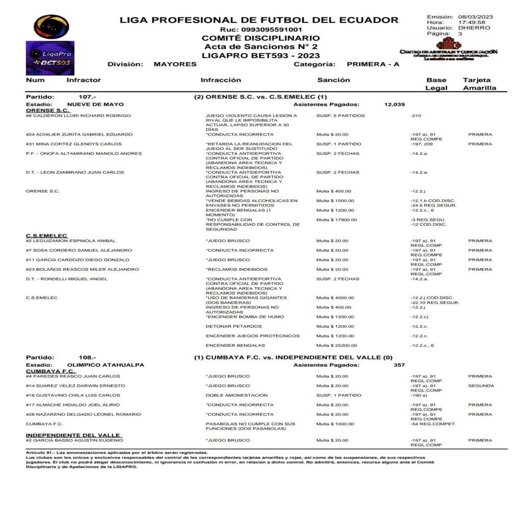 En el compromiso ante Orense en Machala, así lo dio a conocer el Comité Disciplinario de la Liga Profesional de Fútbol del Ecuador a través de un acta de sanciones.