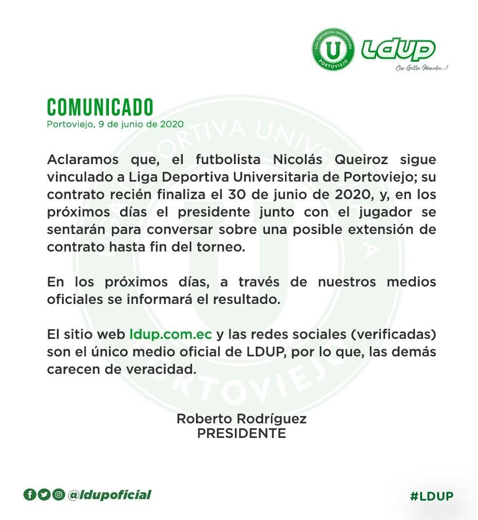 En las últimas horas se corrió el rumor de que la directiva de Liga de Portoviejo iba a desvincular del club al uruguayo Nicolás Queiroz, sin embargo, el club emitió un comunicado ratificando su deseo de renovar al futbolista.