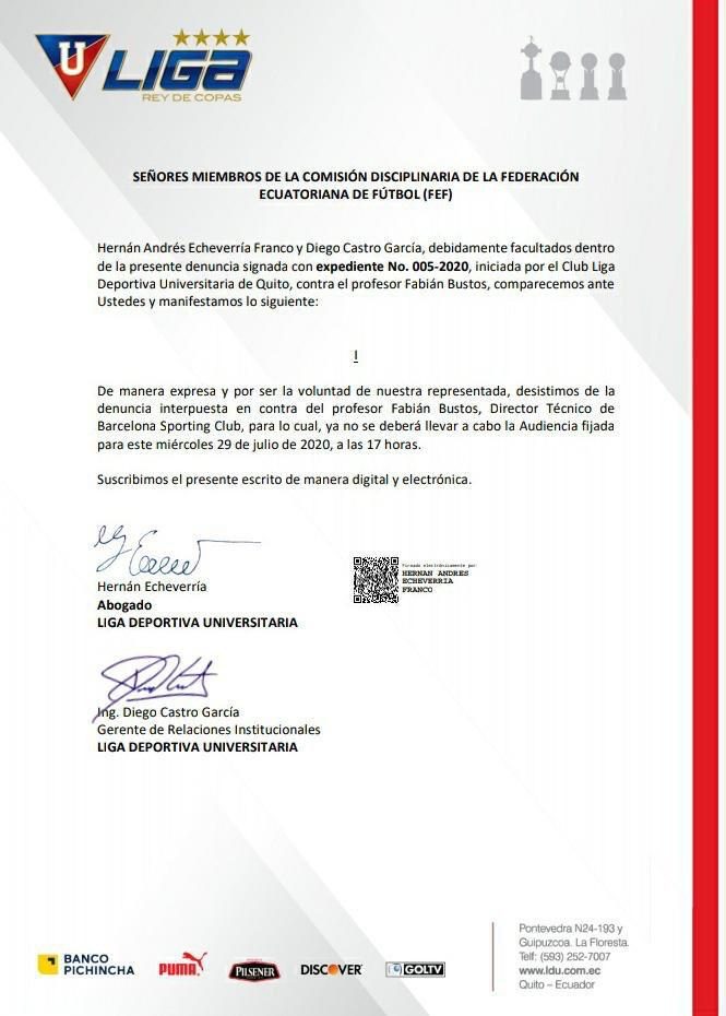 Tras entablar conversaciones con Carlos Alejandro Alfaro Moreno, presidente de BSC, y Aquiles Álvarez, vicepresidente deportivo del club amarillo, la dirigencia de Liga Deportiva Universitaria de Quito desistió de la denuncia en contra de Fabián Bustos.
