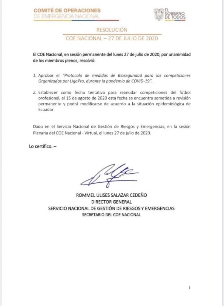 Tal como se había adelantado el día de ayer, el COE Nacional hizo oficial la fecha tentativa para el reinicio de las competiciones del fútbol profesional ecuatoriano, que será el próximo sábado 15 de agosto.