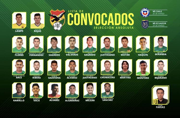 La Federación Boliviana de Fútbol (FBF) publicó la lista de los 26 futbolistas citados por el entrenador venezolano César Farías para los partidos amistosos ante Ecuador y Chile.